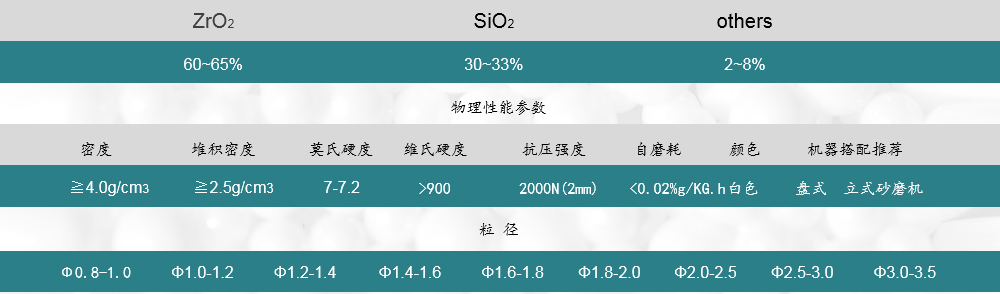 采用滾動成型工藝、通過高溫?zé)Y(jié)制成,珠子內(nèi)部硅酸鋯微粒均勻致密,密度和硬度適中,適合中低黏度物料的研磨和分散,可匹配大部分市面上的砂磨機。